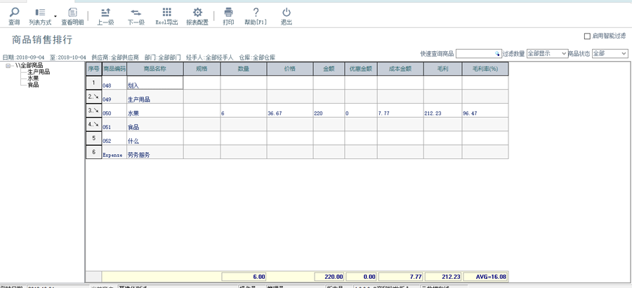 商品销售排行榜我们总希望找到最畅销的商品,淘汰滞销商品,我们希望了解各类商品在所有销售品中所占销售与利润比重,等等这些,便可以通过商品销售排行榜来处理。 操作:销售管理-销售排行榜-商品销售排行榜